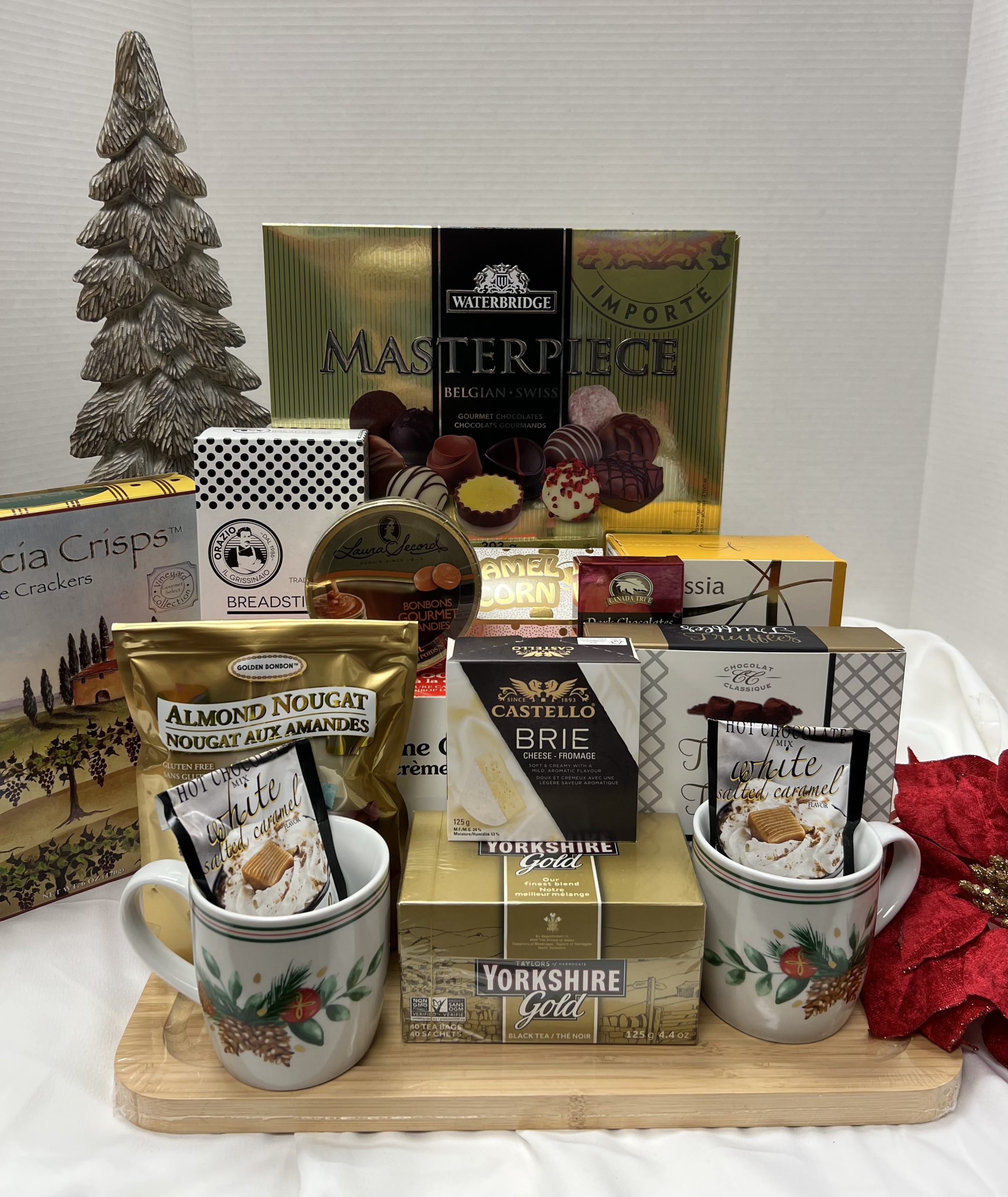 A truly magnificent gift on a bamboo cutting board that has great gourmet products;